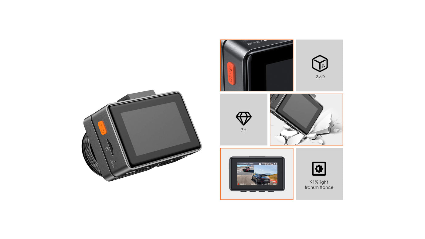 - The dash cam features a 2.45-inch display with a drop- and scratch-proof 2.5D glass screen.