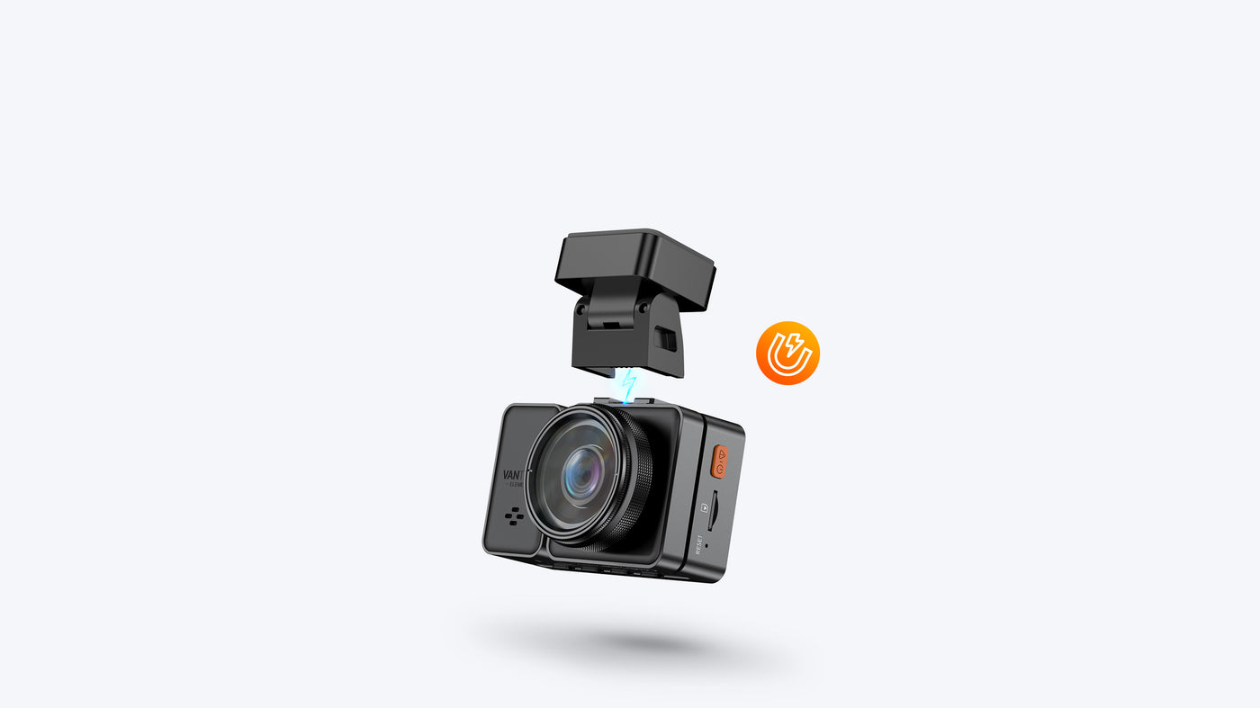 The E2 dash cam mounted on the windshield using a 3M adhesive mount.The front camera's mount features an innovative magnetio structure design, making it easy to remove the front dash cam when needed.