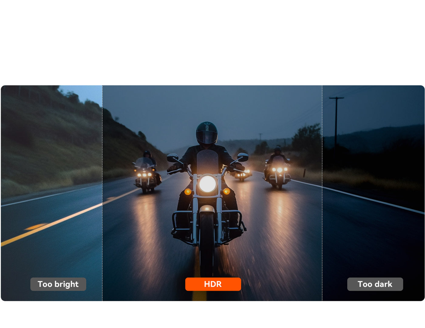 F1's rear camera comes with HDR (High Dynamic Range) multi-exposure technology, which captures maximum image detail in high contrast scenes and corrects exposure levels when a subject is too dark or too bright, so the camera can capture the license plate of cars behind clearly even with their headlights on full beams.