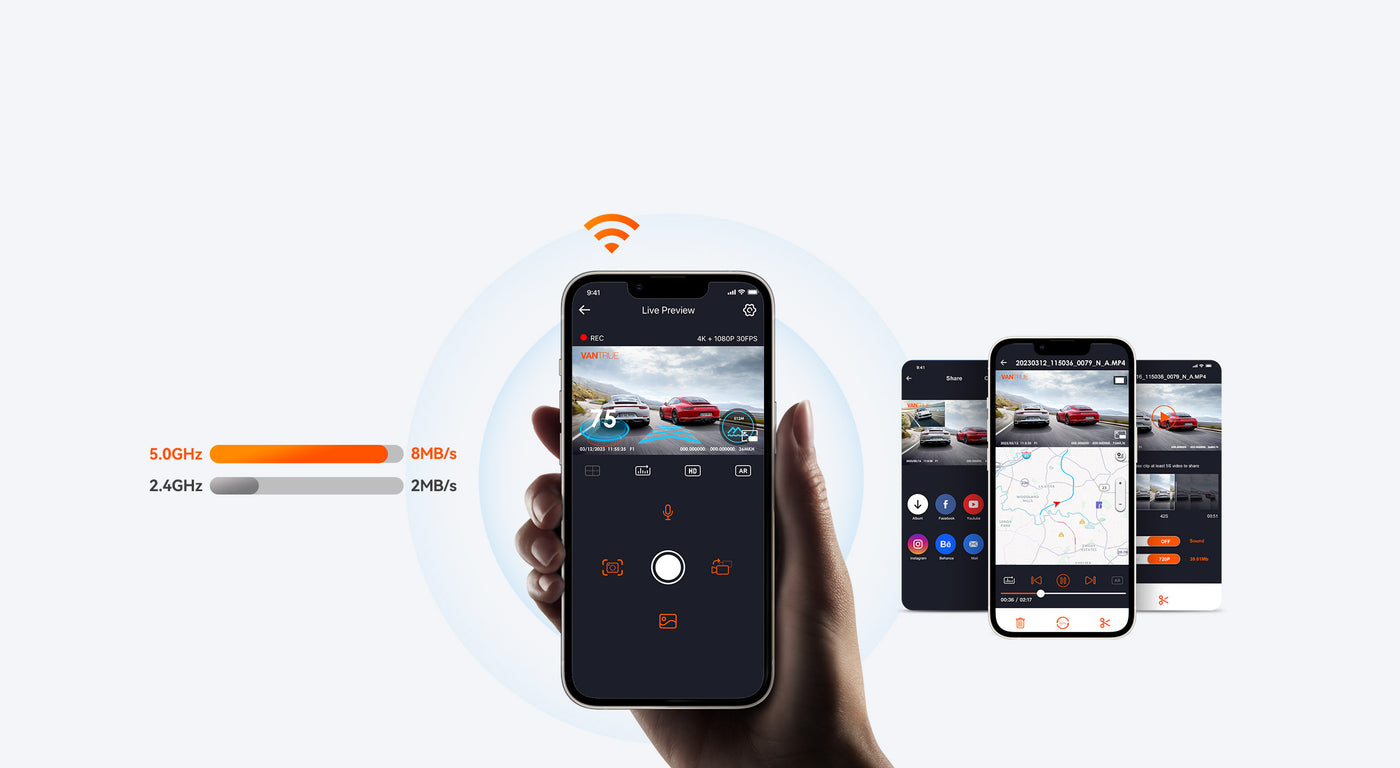F1 built in dual band Wi-Fi (2.4Ghz / 5.0Ghz), allowing you to connect the camera to your Android or Apple phone directly for settings, file viewing and editing. Its superior transmission and stability make it effortlessly view, download, and share your adventures with friends and family!