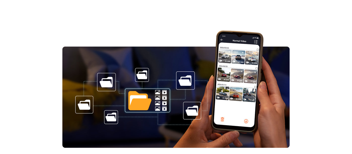 Access your dash cam footage from anywhere, monitoring your vehicle and surroundings in real time via your smart phone.