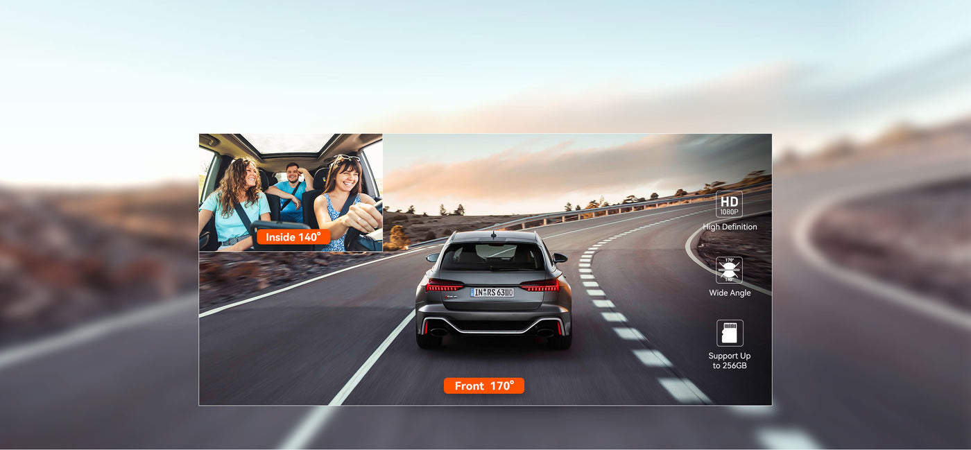 170° front cam and 140° rear cam record situation front and inside the car simultaneously.