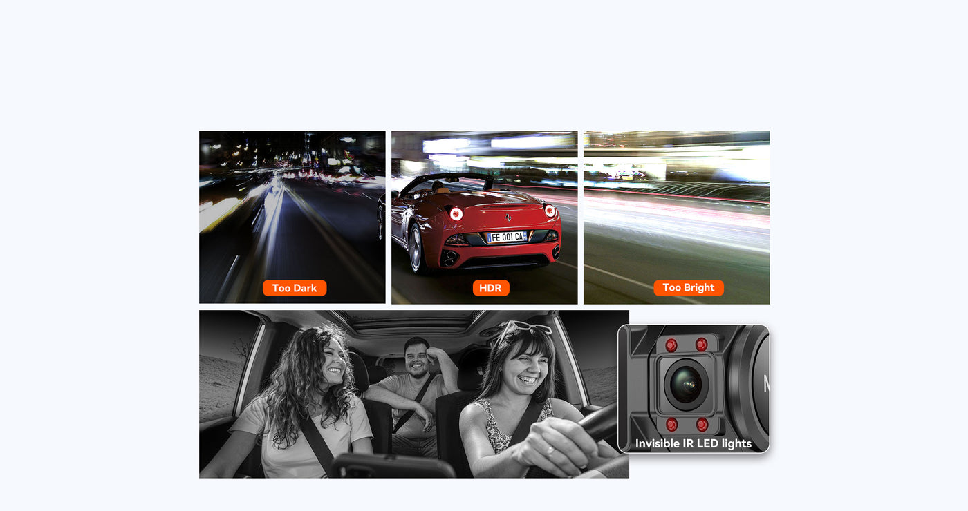Front cam with F1.8 six glass lens and rear cam with F2.0 lens, plus 4 IR lights(rear cam) and HDR greatly enhances night vision at low light environment.
