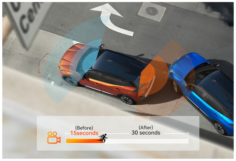 In 15s pre-recording buffered Motion Detection mode, once any motion around the car is detected, 2 cameras will automatically start recording and will save the video for 15 seconds before and 30 seconds after the event occurs.
